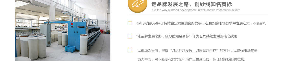 太倉市高陽工貿有限公司是專業從事特種紗生產十數年的一線生產廠家,坐落于江蘇省蘇州市太倉市雙鳳鎮新湖建湖路29號,太倉隸屬長江三角洲經濟圈,交通便捷,經濟發達,是著名的紡織生產基地。 公司歷史要追溯到1982年就成立的新湖毛紡織廠。1996年,毛紡織廠與上海二十二棉在新湖聯合組建了太倉市新湖福利綜合廠。2002年為適應市場的飛速變化,公司轉制重組更名為太倉市高陽工貿有限公司。同時公司適時調整生產經營策略,調整產品品種結構,把生產特種紗作為主要發展方向,純棉、滌綸竹節紗是我們的主要產品。 公司多年來始終保持了持續穩定發展的良好勢頭,在激烈的市場競爭中發展壯大,不斷前行。我們把“走品牌發展之路,創紗線知名商標”作為公司持續發展的核心戰略。以市場為導向,堅持“以品種求發展,以質量求生存”的方針,以增強市場競爭力為中心,對不斷變化的市場環境作出快速反應,品牌戰略的實施。公司注重專業人才的引進和先進技術的生產化應用,具備較強的研發設計和生產能力。 公司一直把“品質、創新、誠信”作為企業文化建設的核心。以品質來獲得客戶的滿意,以創新來贏得客戶的贊賞,以誠信來博得客戶的信心。我們把“準時的交貨期,提供零缺點的產品和服務”作為奮斗目標,贏得了客戶的支持和良好的市場信譽。 高陽工貿有限公司愿與廣大客戶加強合作,共享信息,迎接挑戰,共同發展。客戶需求。了解詳細>>